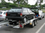 Auf diesen Samstag habe ich nicht nur ein "wenig" gefreut! Mit dem gemieteten Anhänger also wieder Richtung Hannover und das Objekt der Begierde verladen. Die Rückfahrt zog sich durch zahlreiche Staus auf gute 4 Stunden, zum Glück wartete in Viersen schon der angefeuerte Grill auf uns. Noch am gleichen Tag kam der alte Herr auf die Hebebühne und wurde begutachtet. Zwar gibt es die ein oder andere Stelle, an der Arbeit nötig ist, aber die Substanz ist absolut prima: kein schiefes oder nicht originales Blech sondern alles da wo es hingehört; manchmal rostig aber ehrlich. Und das Nonplusultra: keine Fehlteile. Sogar der originale G-Lader und die komplette Fahrzeugmappe mit Bordbuch und Zusatzbetriebanleitung waren vorhanden.
