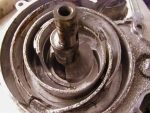 Grundsätzlich ist das Führungslager/Nebenwellenlager des Verdrängers, auch "Wackelauge" genannt, unproblematisch. Gerade bei der Verwendung von kleinen Laderrädern ist es aber dauerhaft einer thermischen Belastung ausgesetzt und diese Probleme können zu Hitzeschäden in dem Therban-Elastomer führen - das Lager eiert übermäßig und scheuert sich im Auge des Verdrängers frei. Erhöhtes Lagerspiel und steigender Verschleiß sind die raschen Folgen, außerdem kann die zunehmend unpräzisere Führung des Verdrängers dazu führen, dass sich die Kammerwände berühren. Weitere Schäden sind die unausweichliche Folge, wenn der Schaden nicht rechtzeitig erkannt wird.
