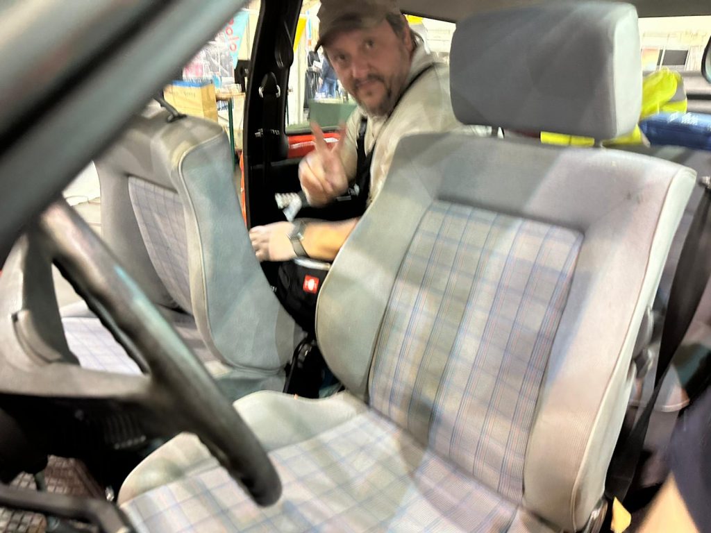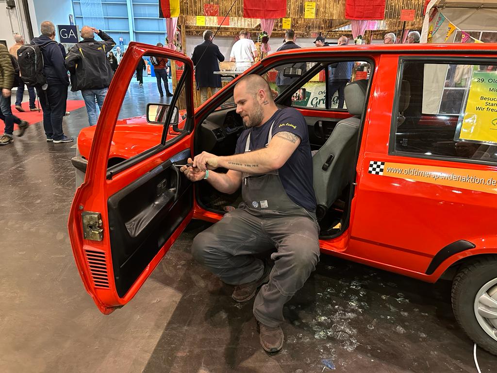 Wir haben den Polo auf unserem Messestand auf der Techno Classica ausgestellt und für den guten Zweck geworben. Bei der Gelegenheit spendierten wir dem Polo Steilheck neue Türverkleidungen in zur Ausstattung passendem Grau – weil die alten schon ziemlich „durch“ waren. Ein wirklich schöner 1983er Steilheck mit H-Zulassung wartet auf seinen Gewinner!