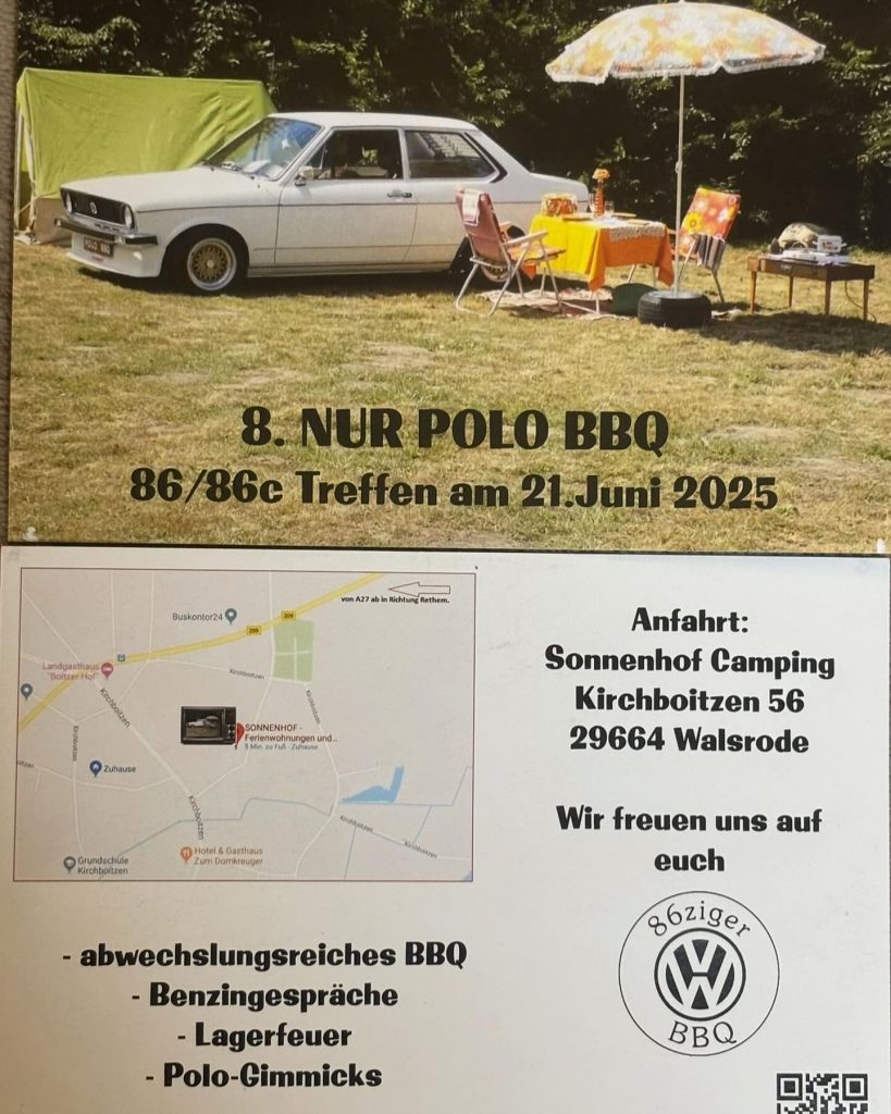 Die 86er laden ein! Am 21. Juni 2025 findet das „NUR Polo 86/86c BBQ“- Treffen in Kirchboitzen, bei Walsrode statt.