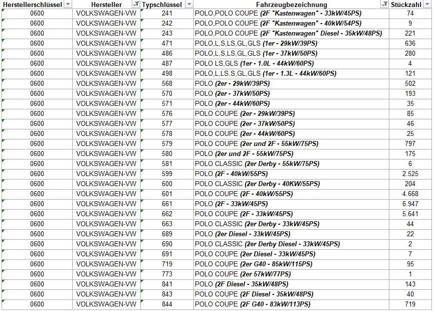 Zahlen, Zahlen, Zahlen: Wir haben für Euch mal die KBA-Bestandsdaten vom 1.1.2020 (neuere Zahlen gibt es noch nicht) nach den noch zugelassenen Polo 86 und Polo 86c ausgewertet – mit zum Teil erstaunlichen Erkenntnissen.Hinweis: In den Zahlen des KBA tauchen natürlich die diversen Re-Importe, die ohne Typschlüssel (nur Nullen unter „Fahrzeugtyp“ in den Fahrzeugpapieren) zugelassen wurden, nicht mit auf. Aus Erfahrung unserer Mitglieder könnte man aber auch so einen Re-Import noch nachträglich (z.B. im Rahmen der H-Kennzeichenabnahme) mit einer Bescheinigung der Prüfanstalt auf den korrekten Typschlüssel umschlüsseln lassen.